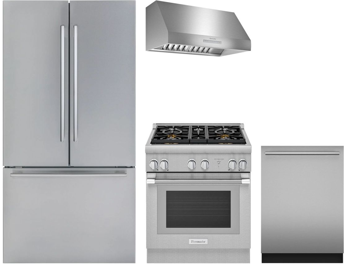 Thermador® 4 Piece Stainless Steel Kitchen Package with a French door refrigerator, freestanding dual fuel natural gas range, under cabinet range hood, and built in dishwasher.Read More